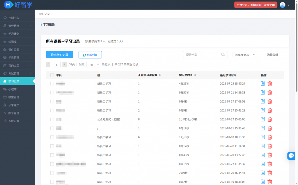 好智學(xué)支持總部-部門-門店三級權(quán)限管理:不同崗位員工分配不同培訓(xùn)路徑;子管理員可獨(dú)立查看和管理所屬人員數(shù)據(jù);支持培訓(xùn)分組管理、標(biāo)簽管理、崗位課程體系管理。這種靈活配置,使得無論是小團(tuán)隊的專項培訓(xùn),還是萬人企業(yè)的系統(tǒng)化學(xué)習(xí)管理,都能輕松適配。